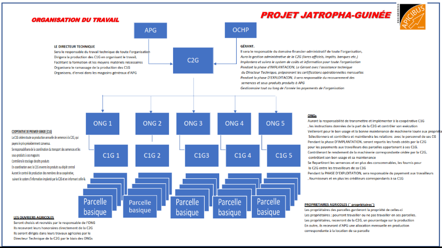 El objetivo del proyecto JG, es la plantación y cultivo de 25.000 Has de jatropha curca, en diferentes áreas de HAUT GUINEE, dando empleo con ello a cerca de 12.000 mujeres actuando en el marco de cooperativas de primer grado, coordinadas por ONGS locales bajo la tutela de OCPH (CARITAS GUINEE).